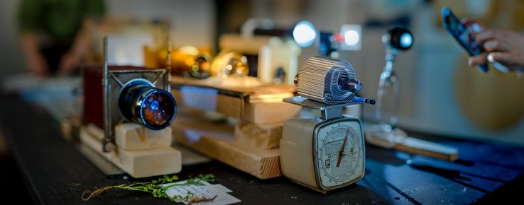 Sketches, prototypes, notes, specimens, calculations, cardboard, glass, lamps, lenses, razor-blades, pens, pencils, traces, and tape take up every inch. The studio is filled.